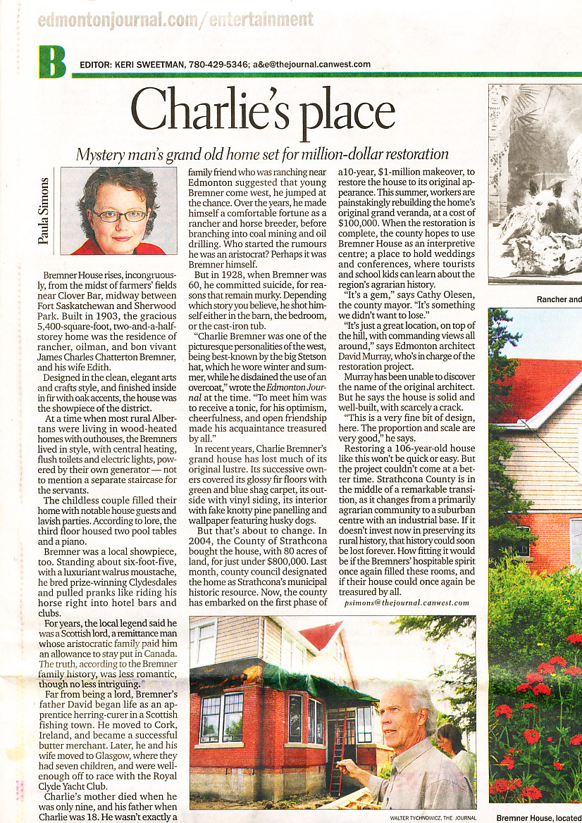 But that’s about to change. In 2004, the County of Strathcona bought the house, with 80 acres of land, for just under $800,000. Last month, county council designated the home as Strathcona’s municipal historic resource. Now, the county has embarked on the first phase of a10-year, $1-million makeover, to restore the house to its original appearance. This summer, workers are painstakingly rebuilding the home’s original grand veranda, at a cost of $100,000. When the restoration is complete, the county hopes to use Bremner House as an interpretive centre; a place to hold weddings and conferences, where tourists and school kids can learn about the region’s agrarian history.