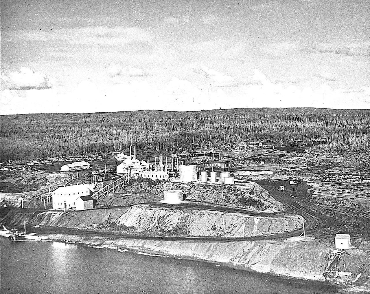 The Government of Canada began geological investigations of the Athabasca tar sands as early as 1870. The impetus for serious exploitation of the tar sands came with the government’s reassessment of the importance of petroleum as a resource, beginning about 1912. By 1926 Dr. Karl Clark, in conjunction with the University of Alberta and the newly formed Research Council of Alberta, developed a process in Edmonton to separate bitumen from tar sands, with limited success. By the late 1930s, Robert Fitzsimmons had successfully constructed an on-site separation plant at Bitumount, which he named in 1937, using a modification of Clark’s separation process. However his operations were not commercially viable and, after with many technical setbacks, he failed to attract investors. In 1943, he sold International Bitumen to Lloyd Champion who then entered into an agreement with the Province of Alberta to develop a new larger scale separation plant. Champion failed to fulfill his agreement to contribute 50% of the funding and the government carried on as sole investor under the direction of Dr. Clark. By the end of summer 1949, after 5 weeks of successful operations and despite many technical setbacks, the government declared the commercial viability of its operations and continued looking for investors. More than $750,000 had been spent on this well-engineered plant. Unfortunately, after the 1947 conventional oil discovery at Leduc, serious investors were never found and the plant, after intermittent operations, closed permanently in 1958.